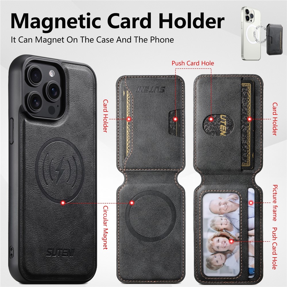 SUTENI M3 For iPhone 14 Pro Max Magnetic Case Cowhide Texture Leather Back Cover with Card Bag Kickstand – Black