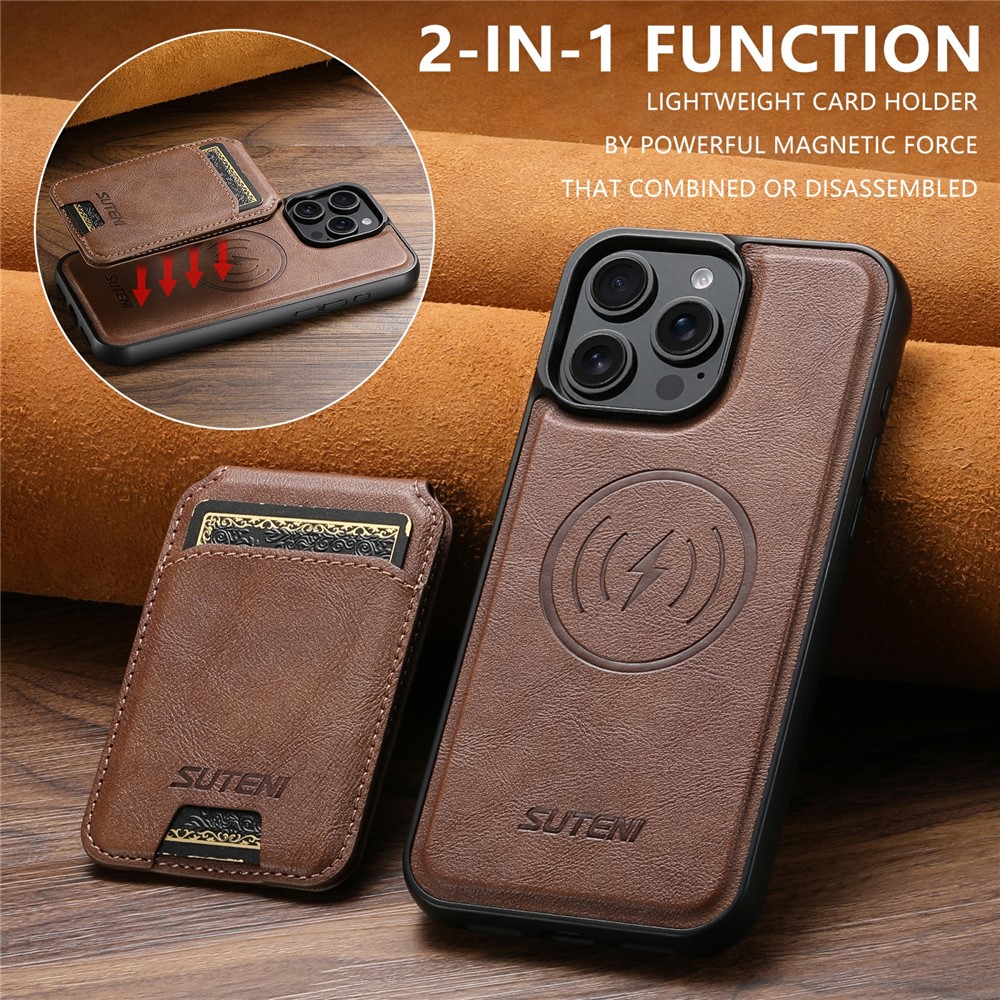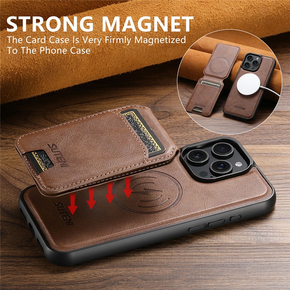 SUTENI M5 For iPhone 13 Pro Magnetic Case with Card Bag Cowhide Texture Leather Phone Back Cover – Brown