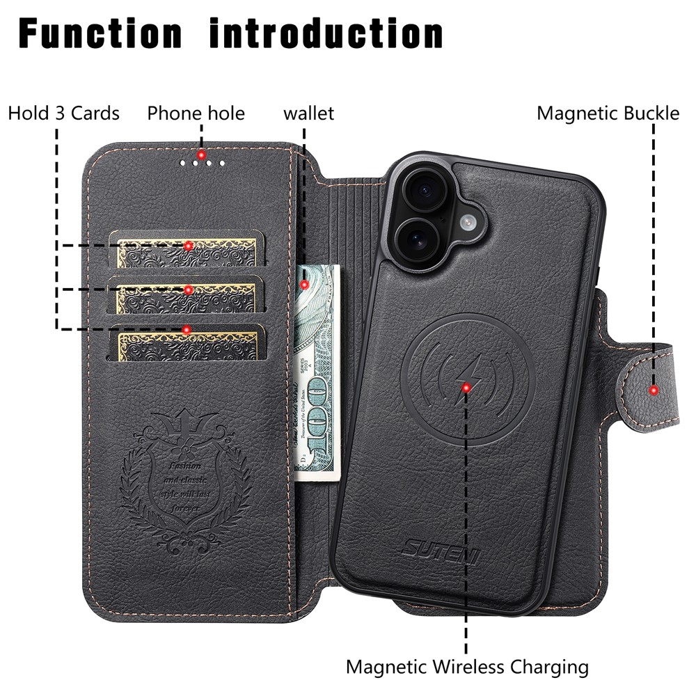 SUTENI Q-05 For iPhone 16 Plus Case Detachable Wallet Stand Litchi Texture Leather Flip Phone Cover - Black