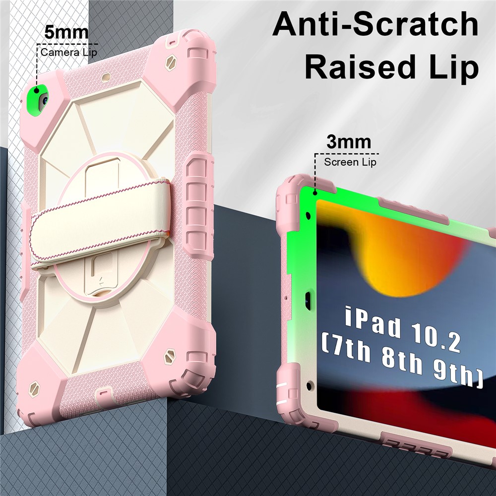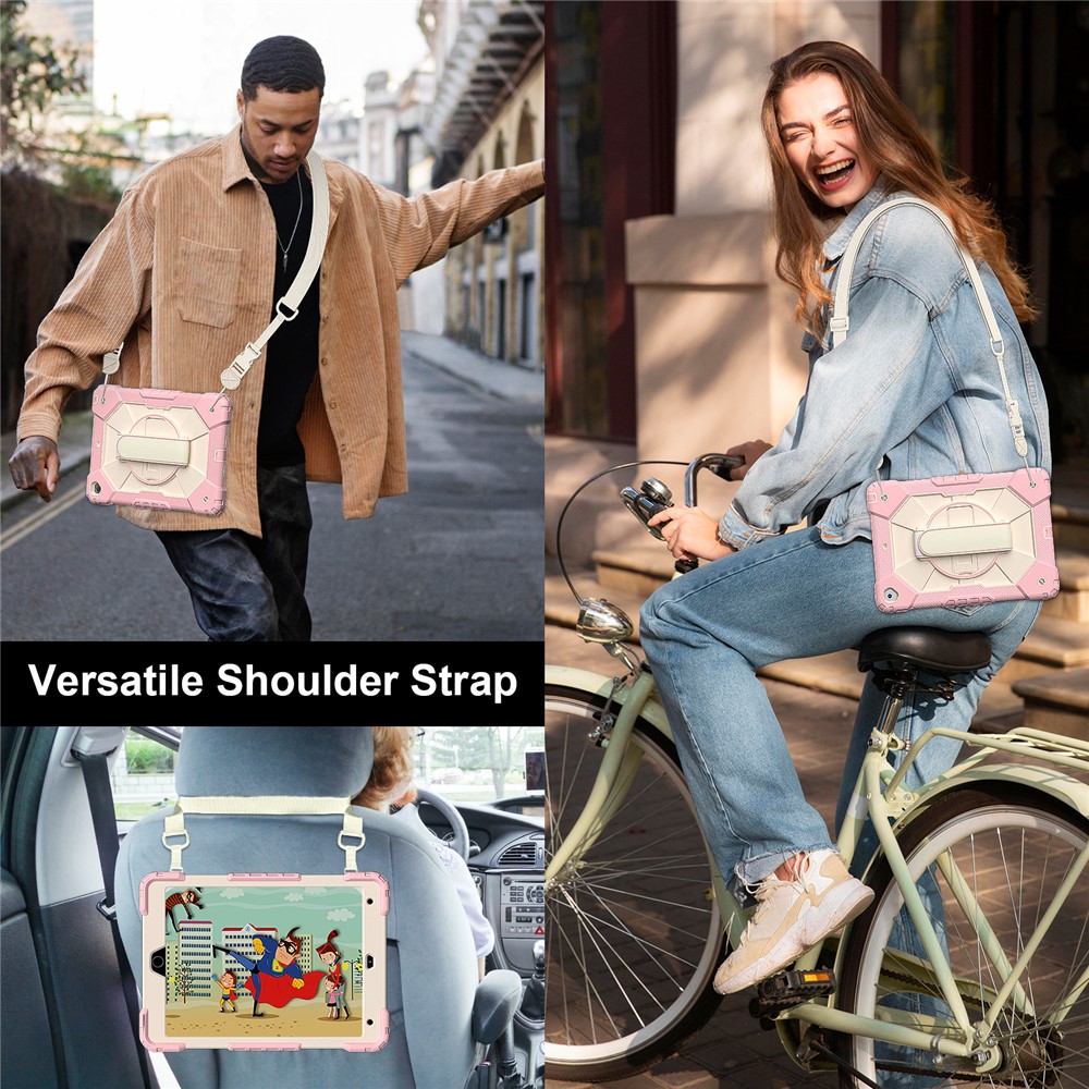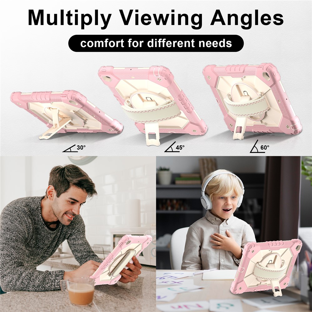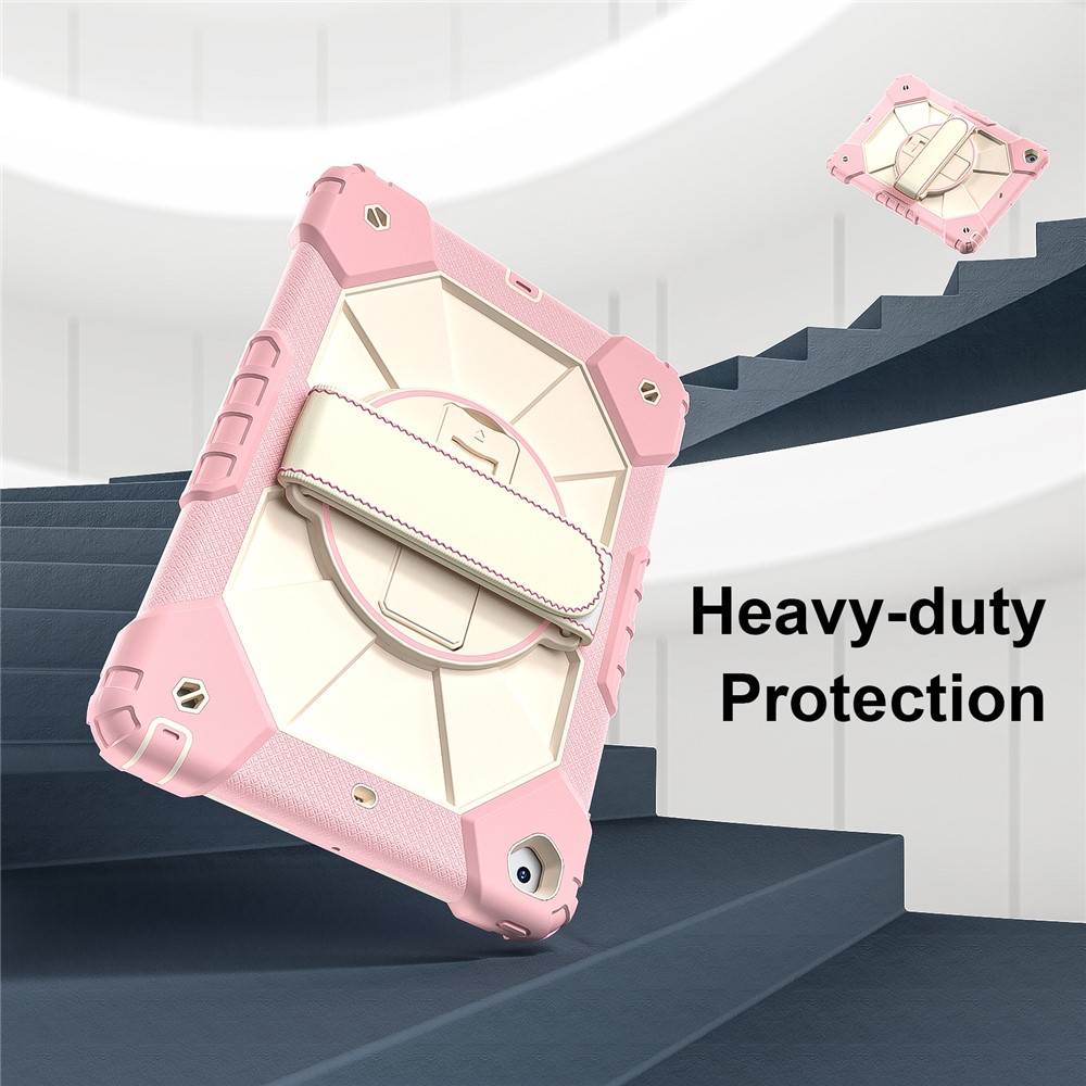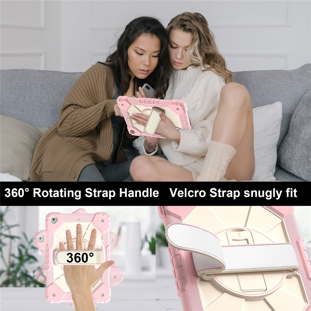 - Folding Kickstand & Hand Strap Features an integrated folding kickstand, allowing hands-free viewing; There is a handy strap on the back of the case, supporting 360-degree rotating, and you can hold your tablet in one hand