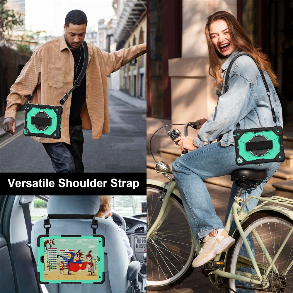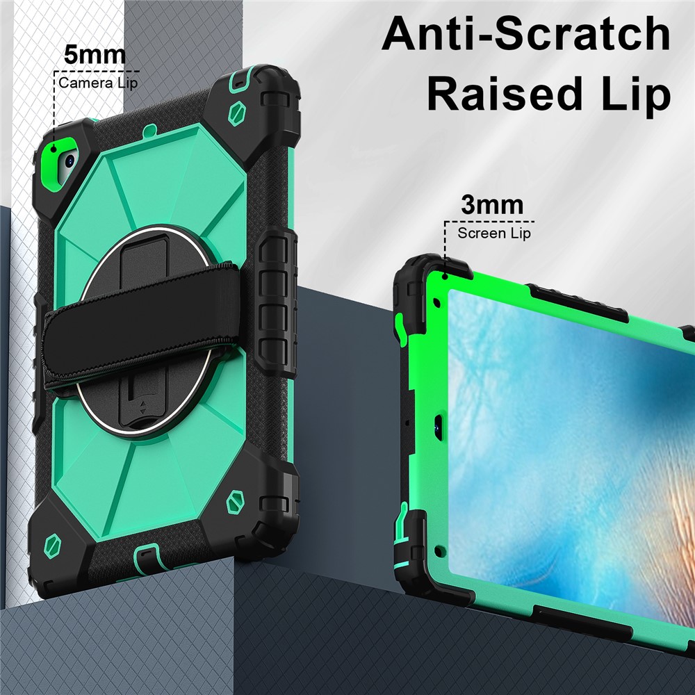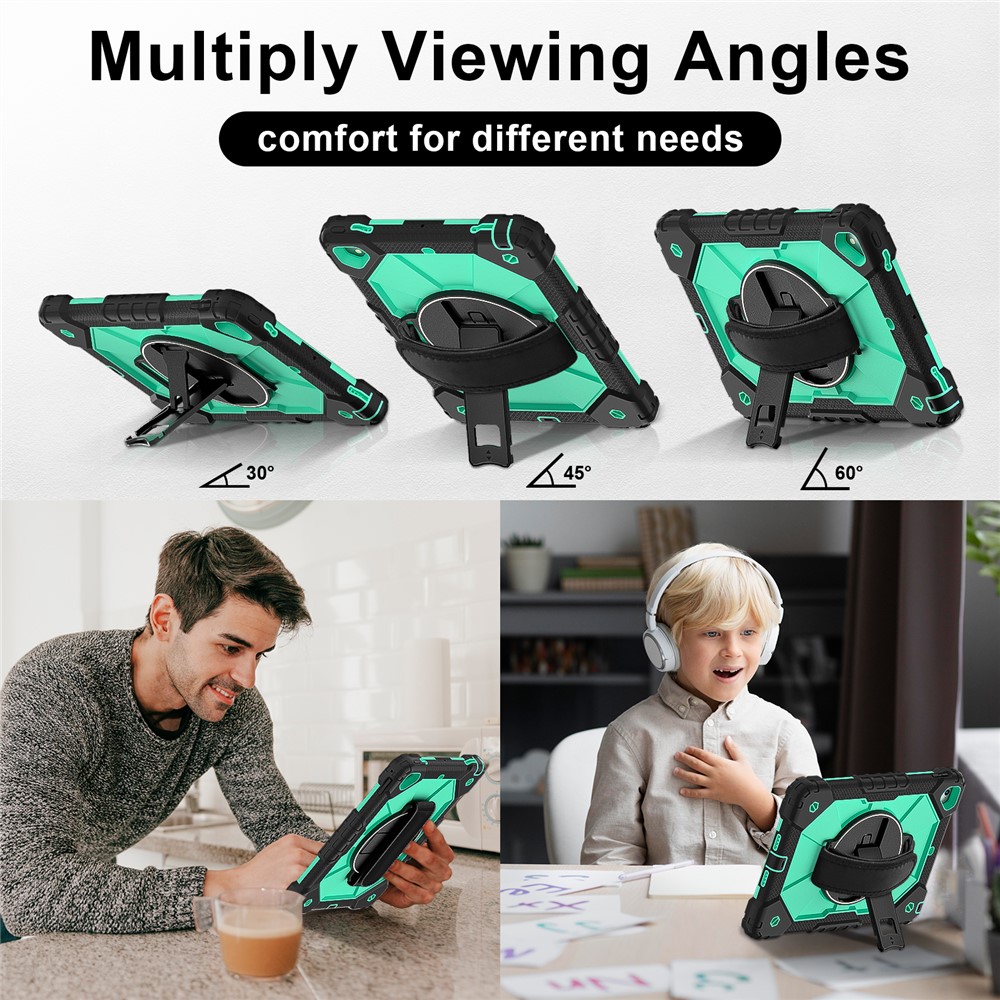 - Folding Kickstand & Hand Strap Features an integrated folding kickstand, allowing hands-free viewing; There is a handy strap on the back of the case, supporting 360-degree rotating, and you can hold your tablet in one hand