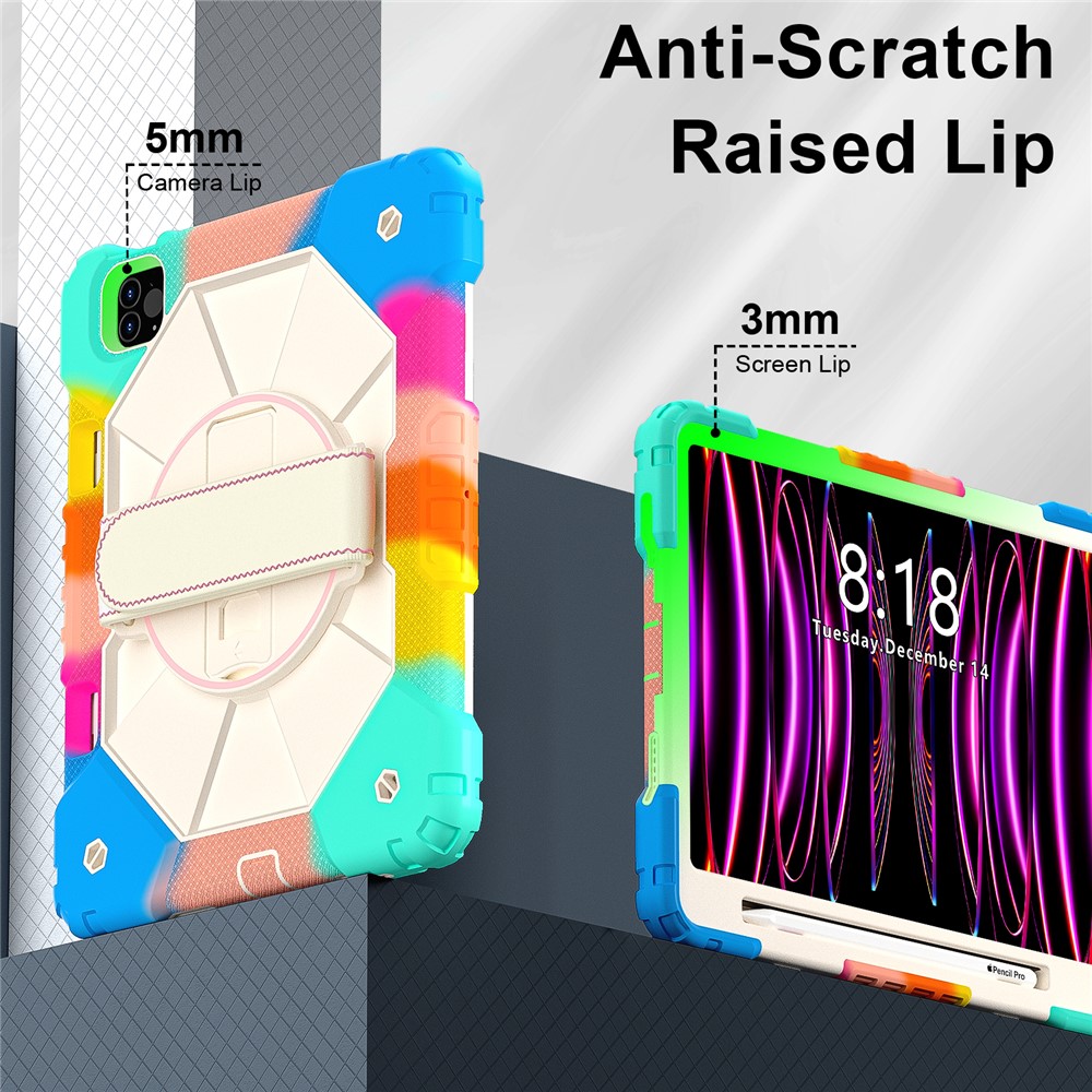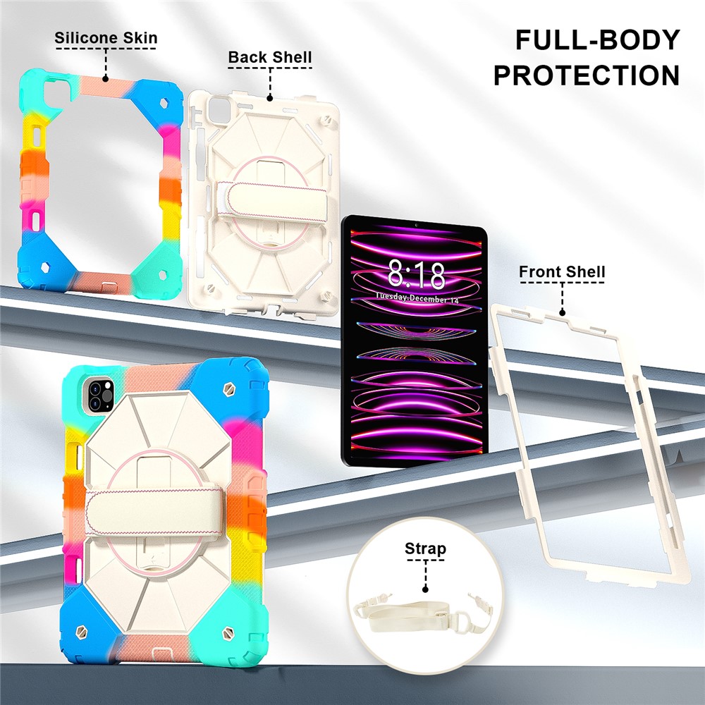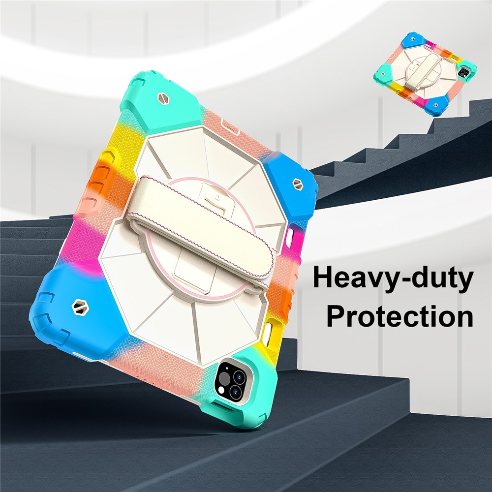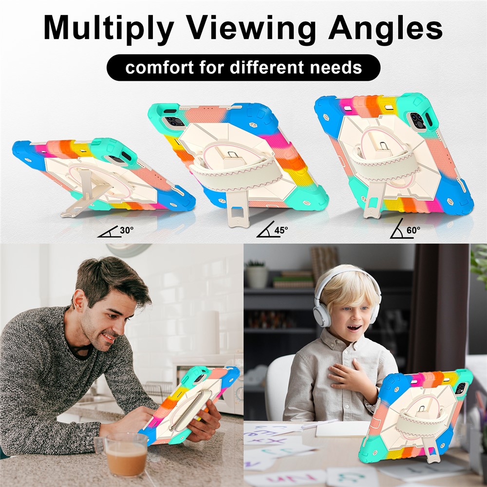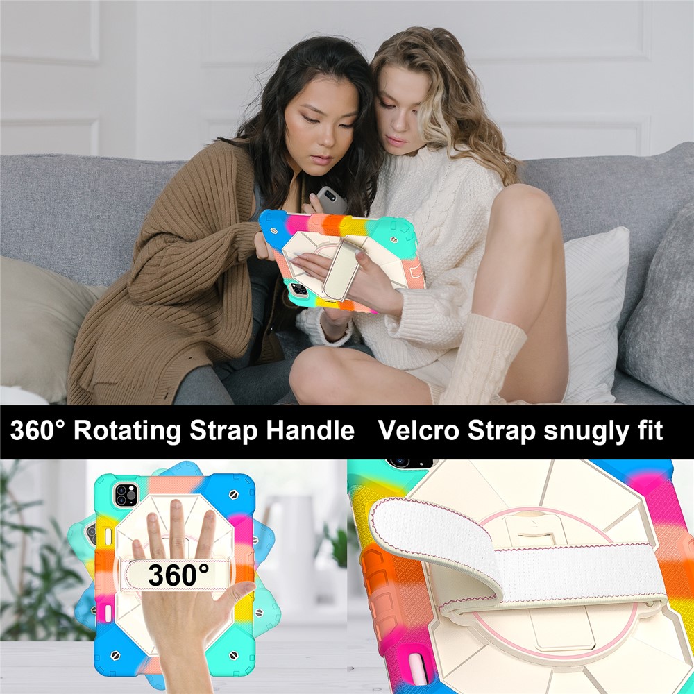 - Folding Kickstand & Hand Strap Features an integrated folding kickstand, allowing hands-free viewing; There is a handy strap on the back of the case, supporting 360-degree rotating, and you can hold your tablet in one hand