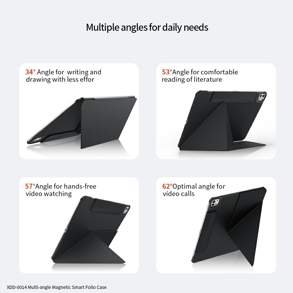 - Multi-Angle Stand: Features a foldable X-pattern cover that supports multiple viewing angles (34°, 53°, 57°, and 62°) for optimized comfort, whether you’re writing, reading, watching, or video calling