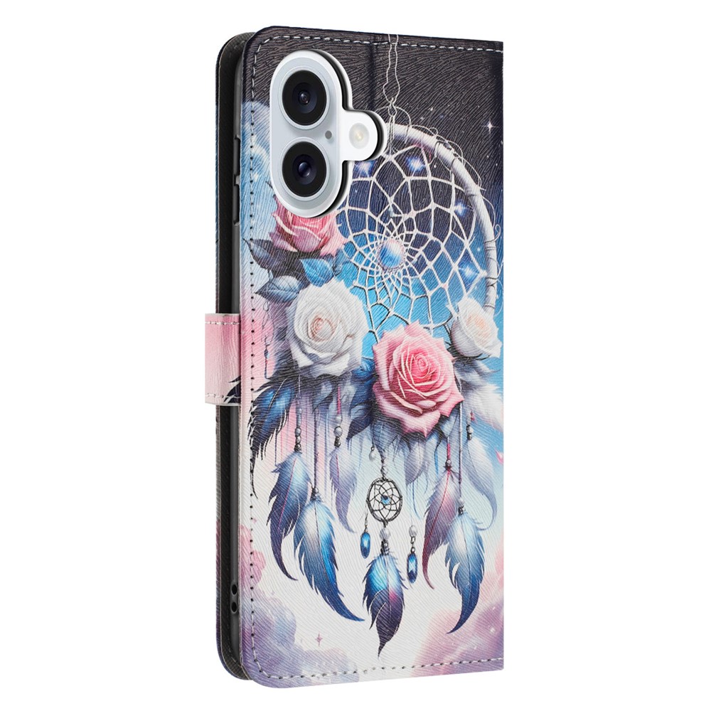 YX-2501 For iPhone 16 Plus Stand Case Pattern Printing PU Leather Wallet Phone Cover with Lanyard – Flower Wind Chime
