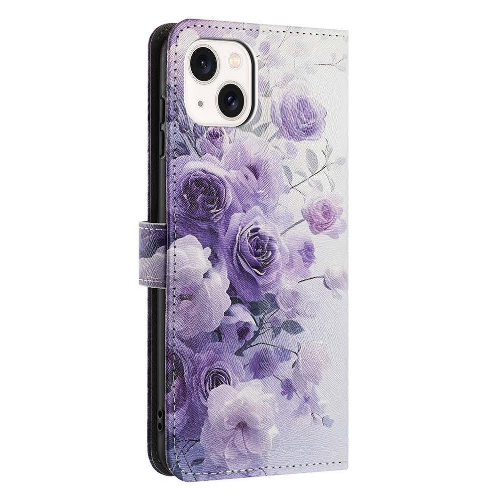 YX-2501 Wallet Case for iPhone 15 Plus / 14 Plus Pattern Printing PU Leather Phone Cover with Lanyard - Purple Rose